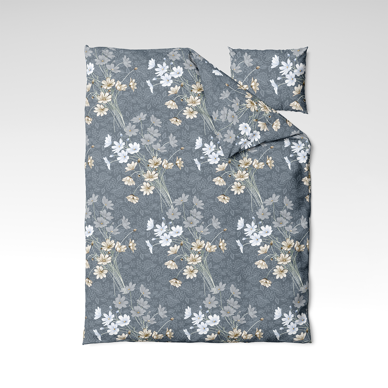 🌙 Twilight Bloom – tummanharmaa kangas, jossa on vaaleita ja lämpimiä kukkakimppuja sekä koristeltu tausta. Luo ylellisyyden, hienostuneisuuden ja salaperäisyyden vaikutelman – täydellinen hienostuneeseen mutta kodikkaaseen sisustukseen.